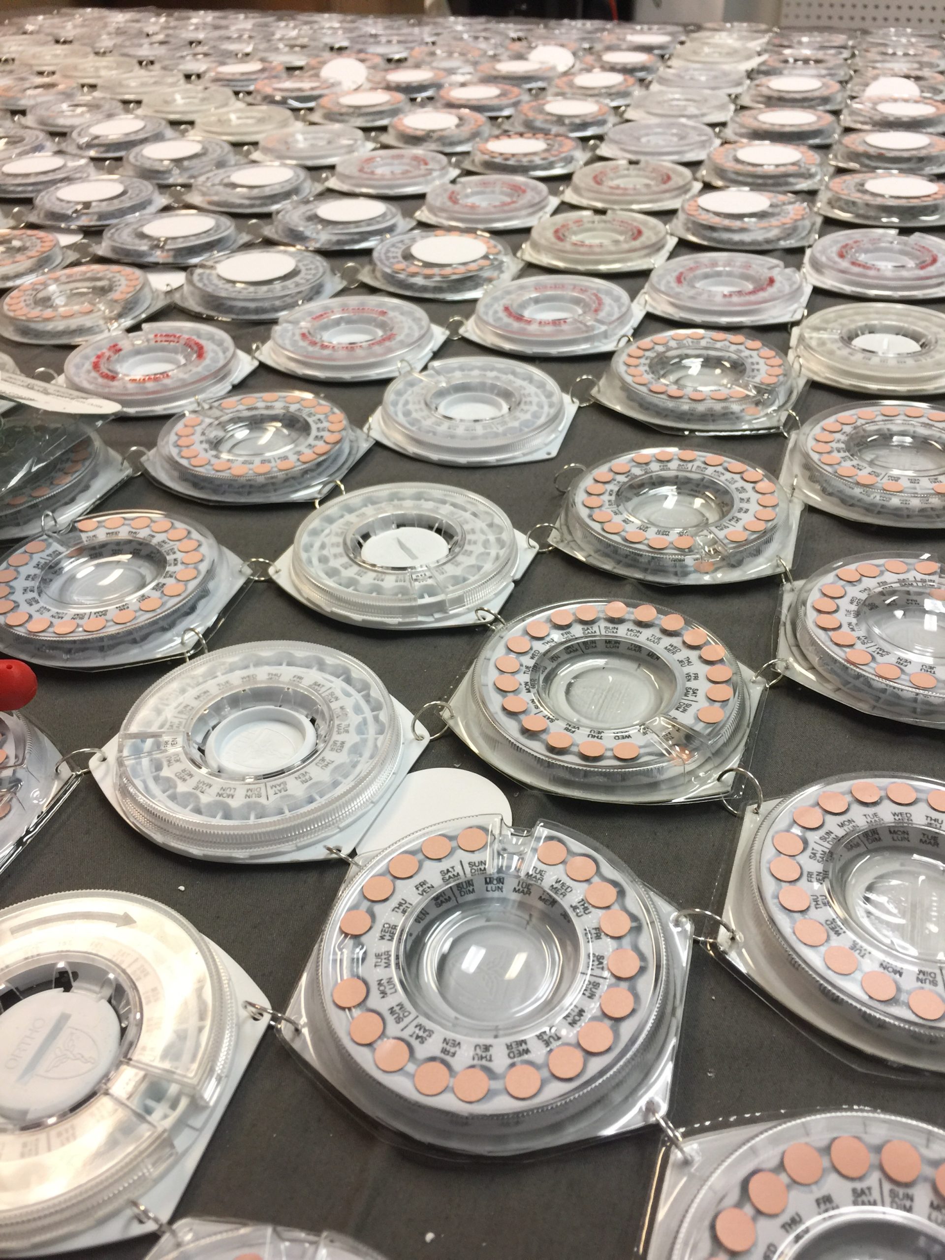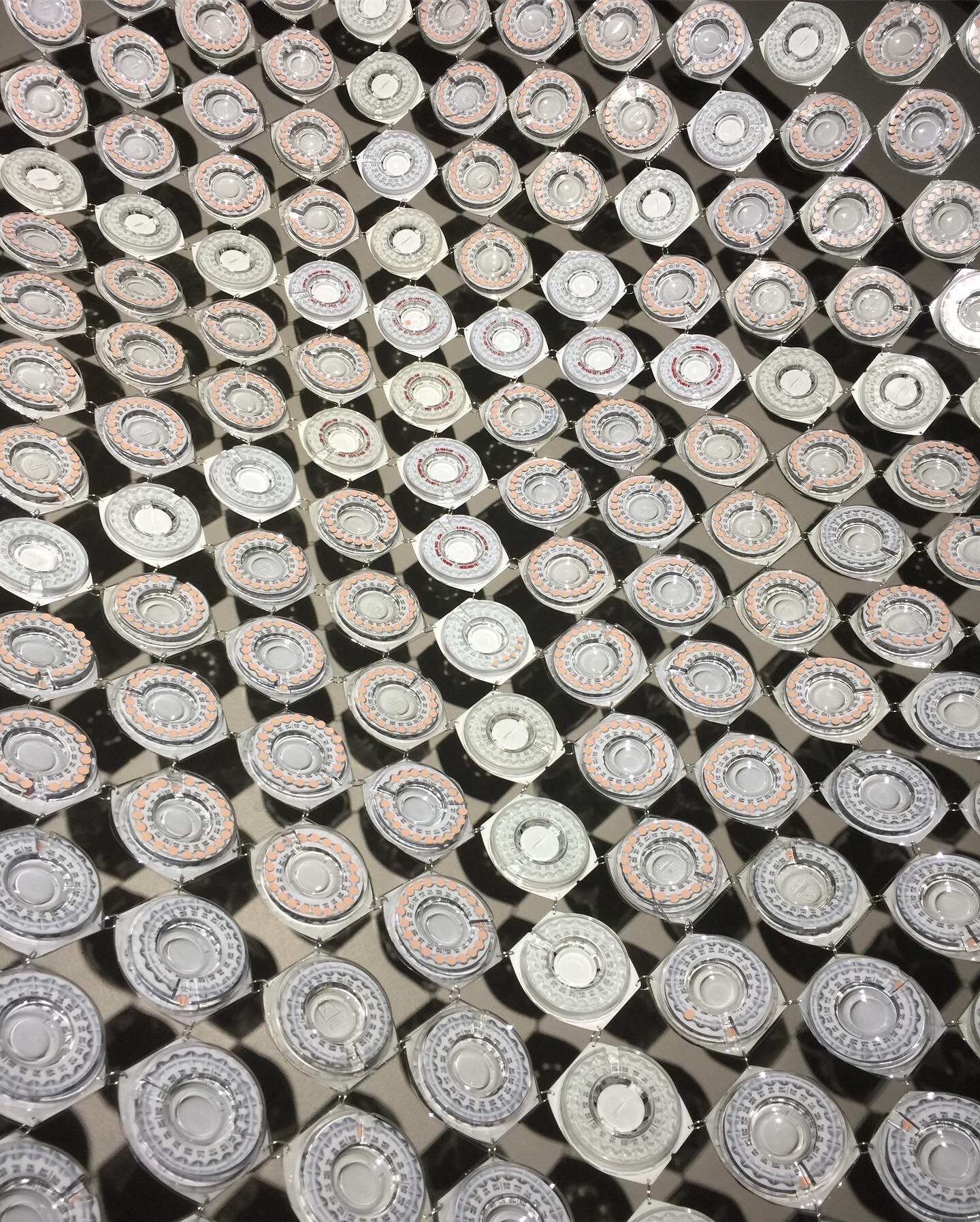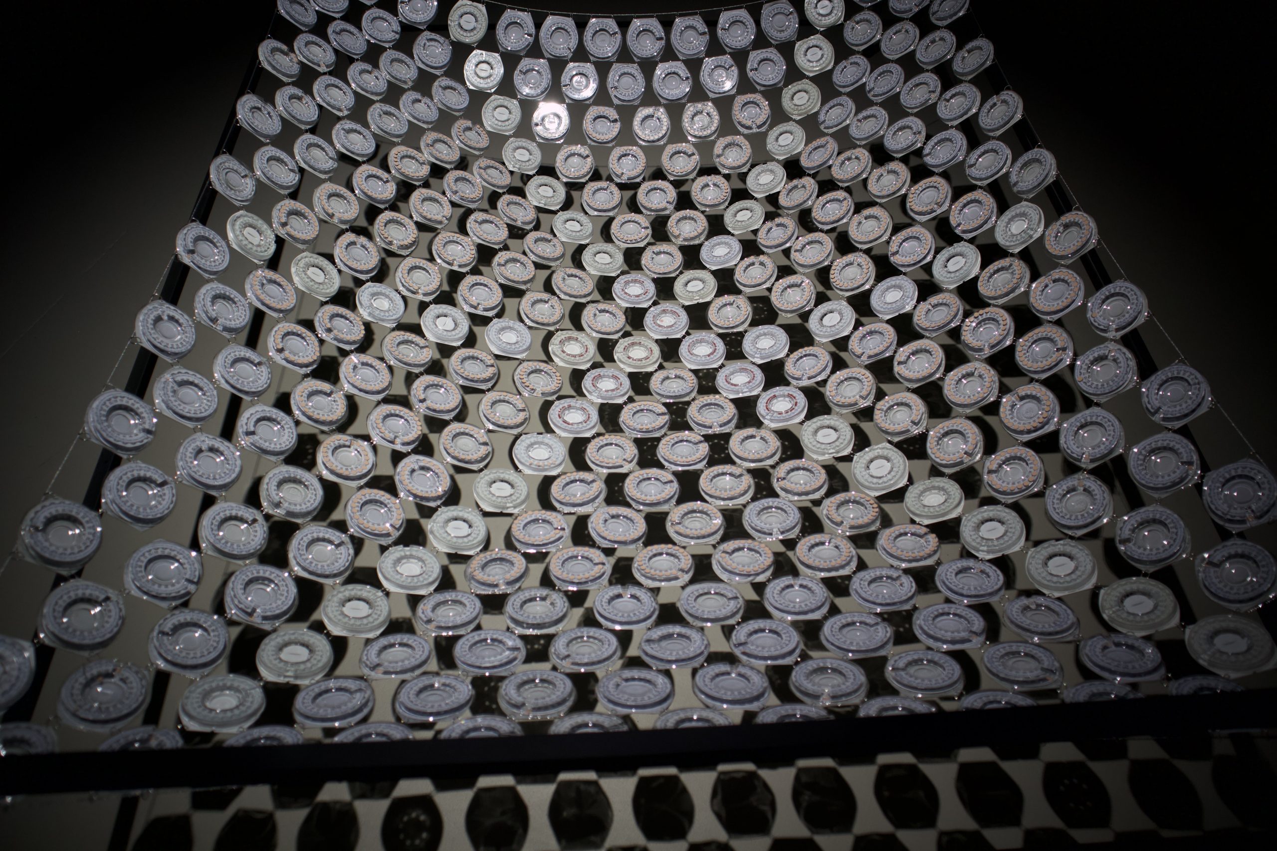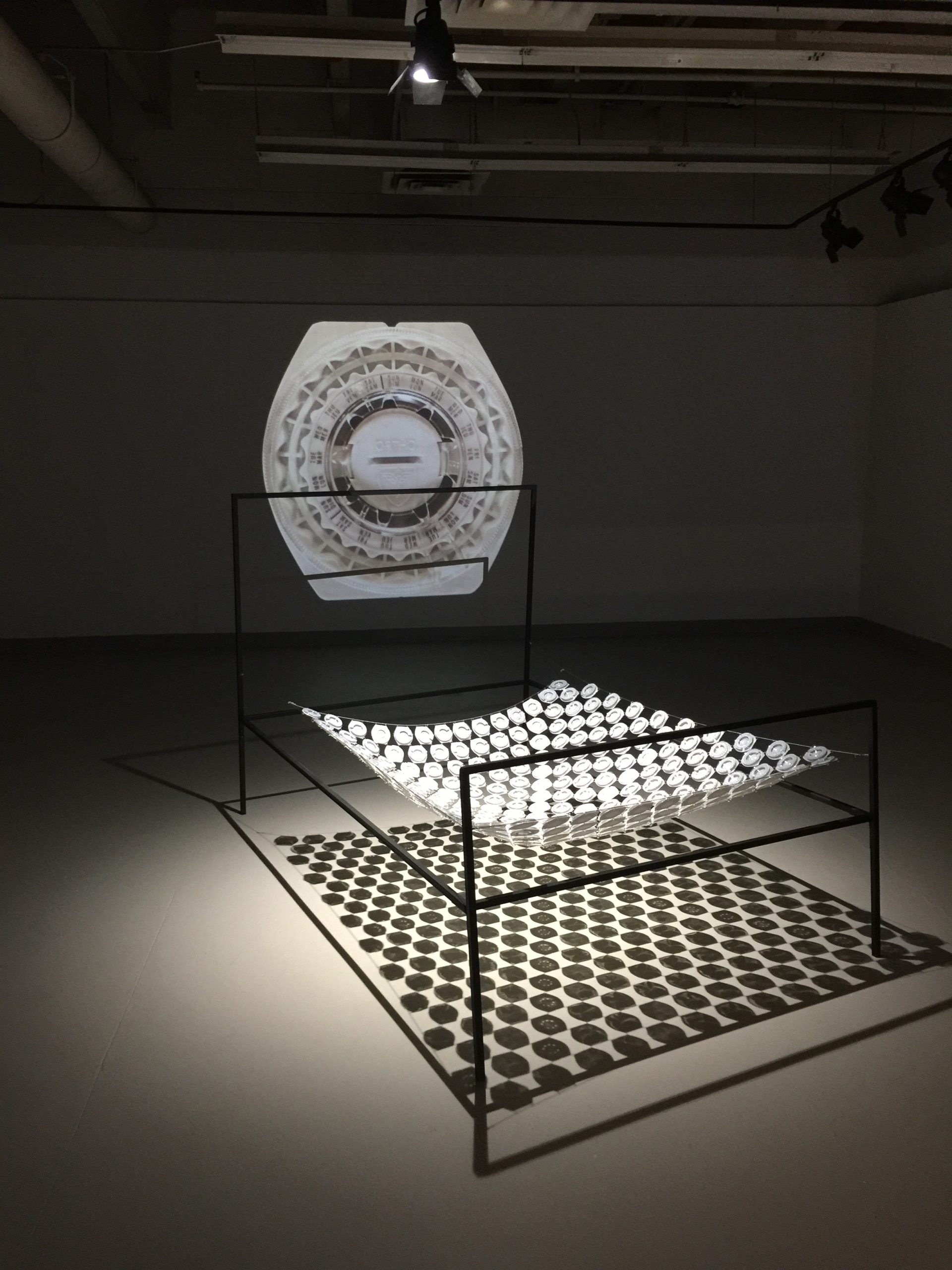The artwork is created to look like an heirloom. Fertility is part of the domestic realm, so a quilt (often an heirloom) used as a bedspread has a place here. Within the logic of a quilt, the appearance of the birth control packaging, called a Dialpak, looks similar to a crocheted rosette; a crafted decoration often made to adorn a bedspread. The quilt is suspended within an abstracted metal bed frame and lit from above so that the quilt casts a distinct shadow of itself across the floor underneath.