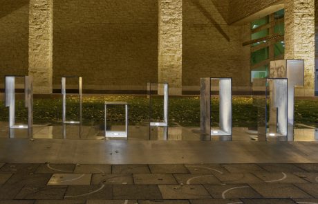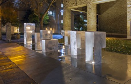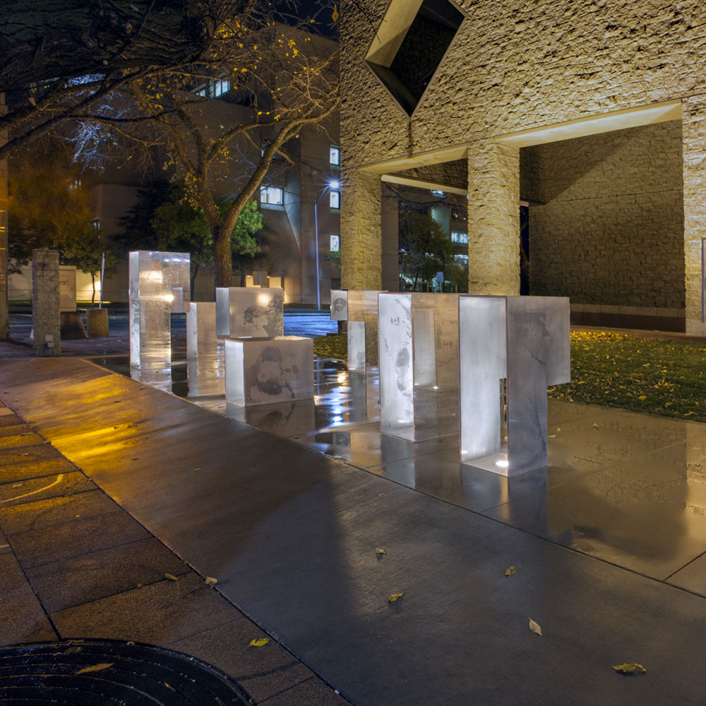 Compositionally, the project comprises a series of folded aluminum totemic elements that describe a multiplicity of paths through the site. Water jet cut into these totems, imagery that speaks to themes of peacekeeping, aid, community, and homecoming creates an aggregation of fractured scenes. Visitors are challenged to seek out and re-assemble the scenes, to be stitched together through their own experiences and associations. Activated by one’s movement through the site, memories come in and out of focus as visual connections are established, released, and reflected.