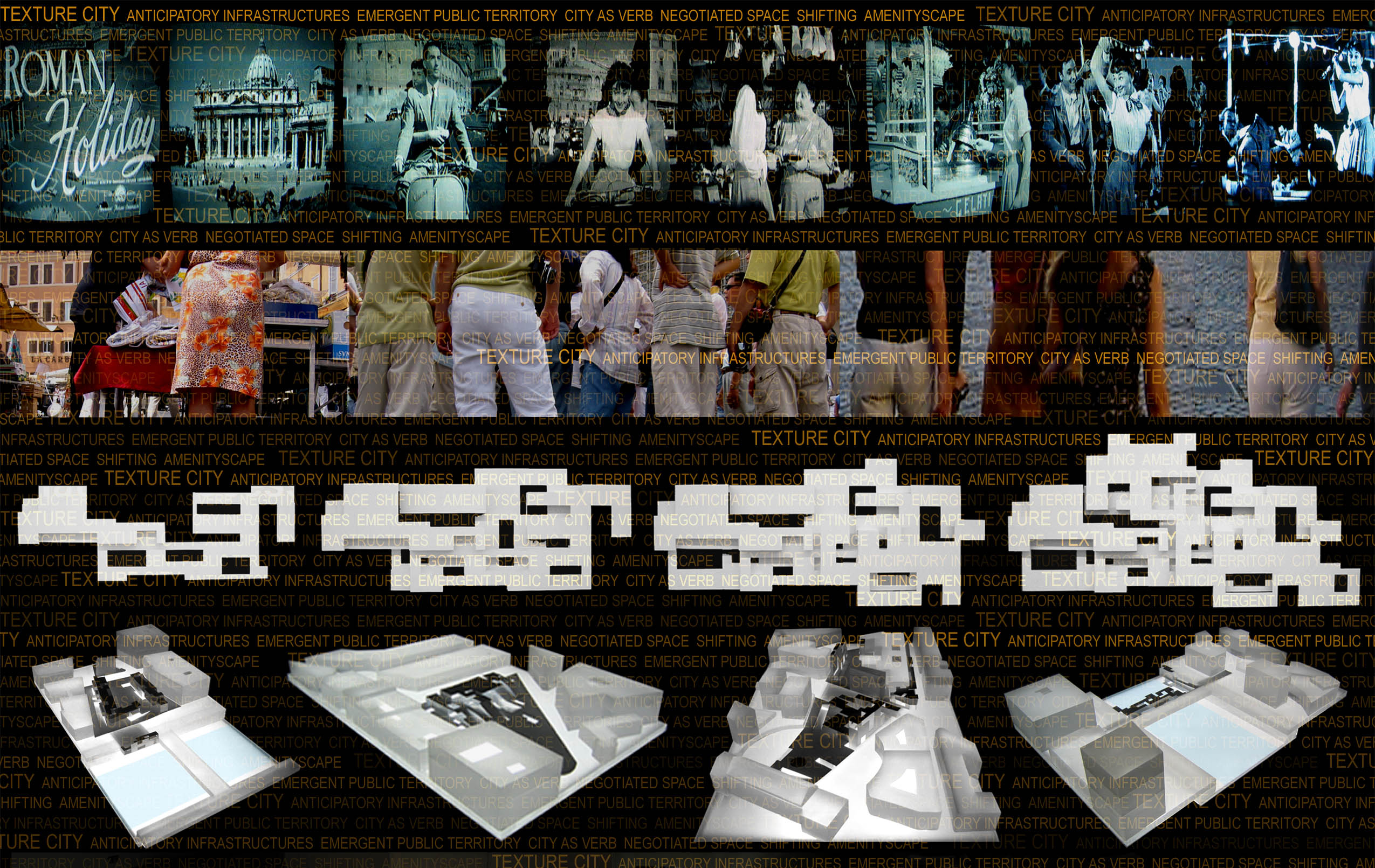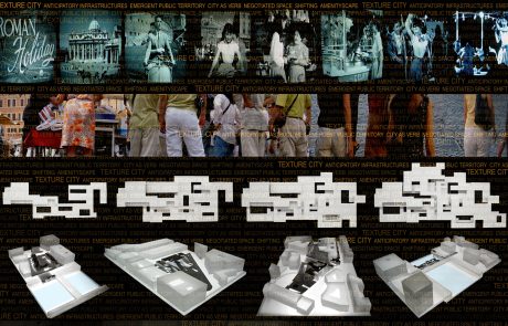Texture City is an interactive installation that focuses on the city as a process, as a verb. It is an investigation that is interested in those phenomena that exist at the intersection between the transience of peoples’ lives and the permanence of the city. Emerging out of the sensibility that is created as one moves from being a voyeur to a participant in the city, the design develops themes that discuss temporality and public engagement as fundamental qualities of the city. This focus on the city as temporal public infrastructure conditions both the design of the installation and the intentions of the architectural and urban proposals presented within the installation’s armature.